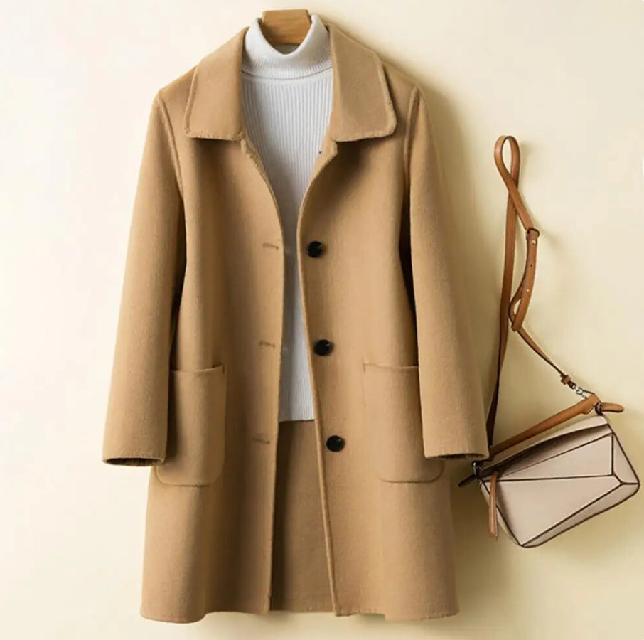 Ten wełniany płaszcz z długimi rękawami jest wykończony eleganckimi guzikami z przodu, gdzie ciepło spotyka się ze stylem.