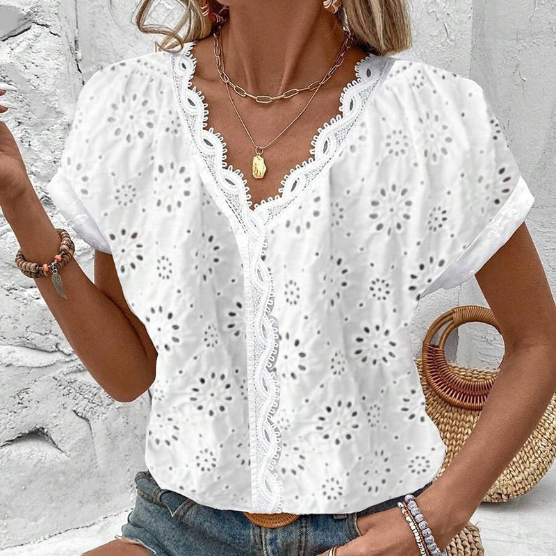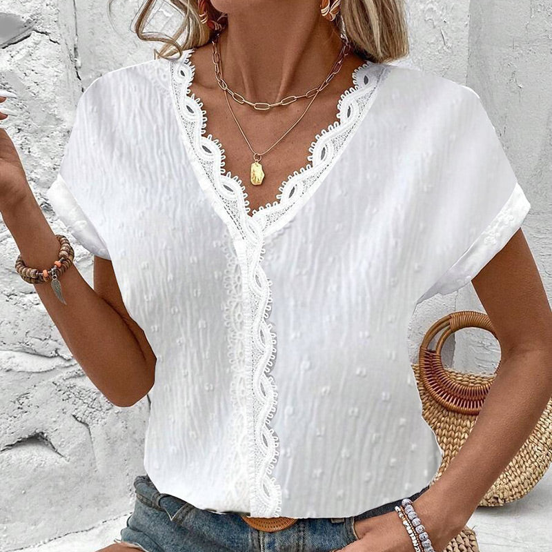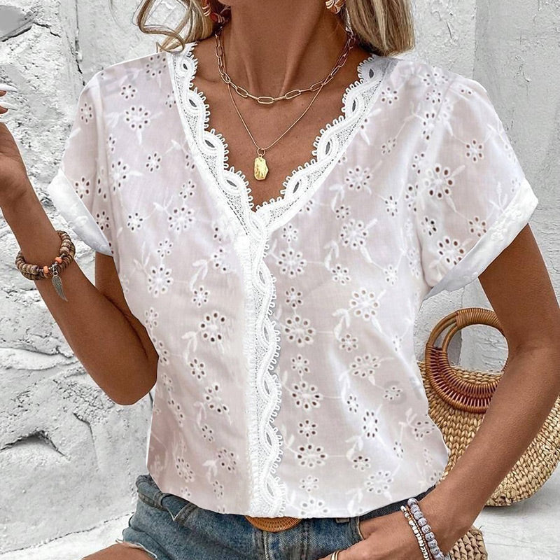 Pakiet obejmuje: 1*Elegancka biała koronkowa bluzka z krótkim rękawami i spiczastym dekoltem