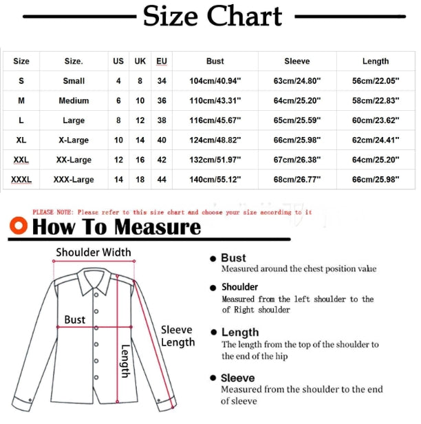 Rozmiar: XXXL Biust: 140 cm/55,12 cala Ramię: 47 cm/18,50 cala Rękaw: 68 cm/26,77 Długość: 66 cm/25,98 cala