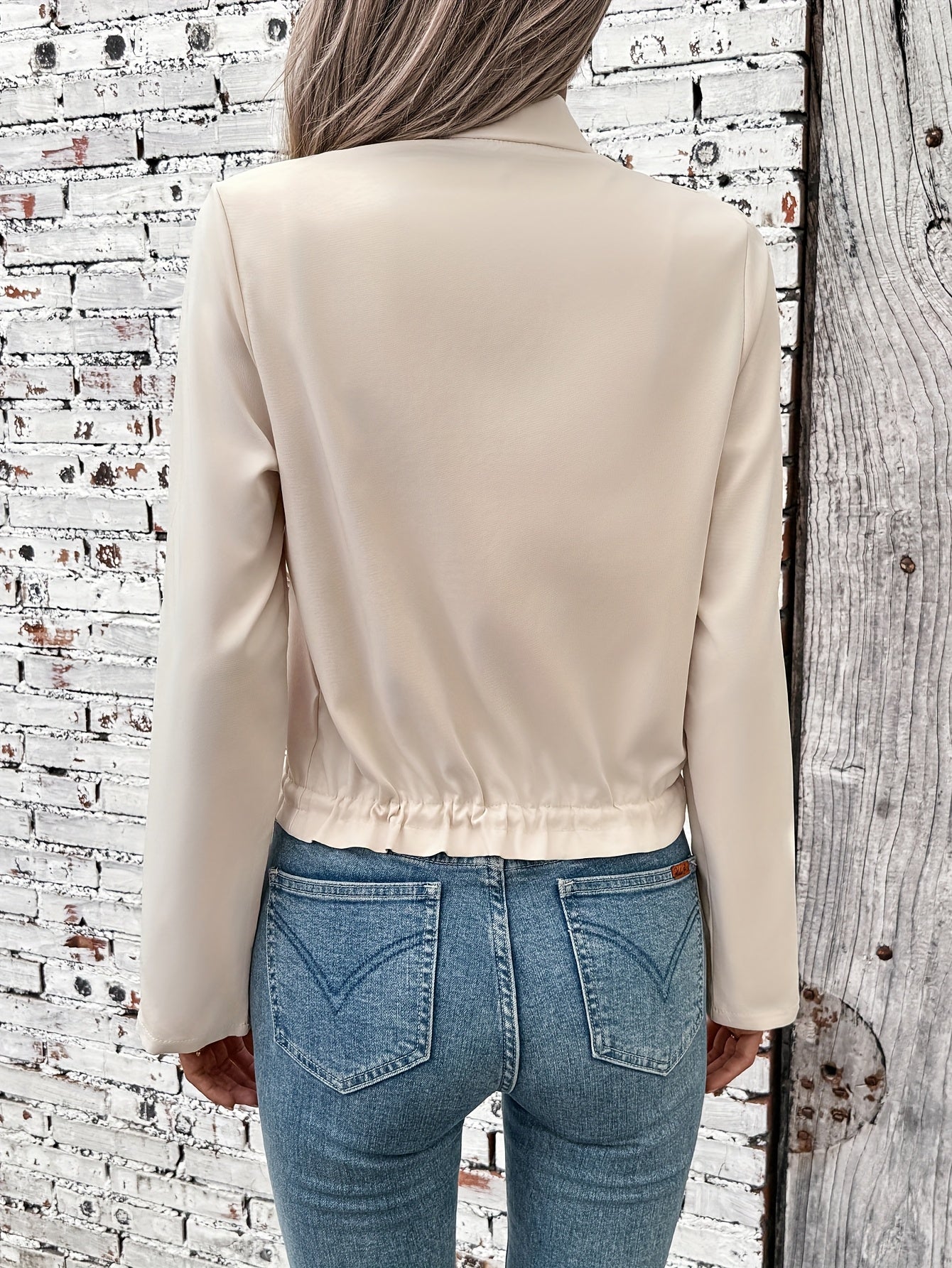 Damska codzienna beżowa kurtka ze stójką – długi rękaw, zapinana z przodu na guziki, kieszenie z klapką
