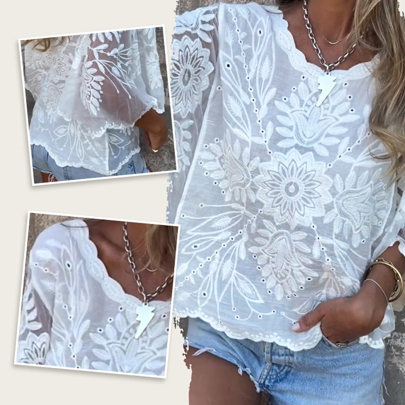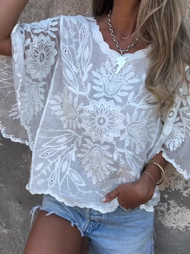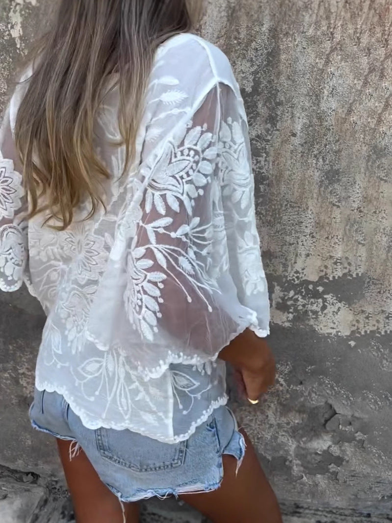 Wykwintny haft kwiatowy: Ta bluzka jest ozdobiona misternym haftem kwiatowym, który nadaje miękką i artystyczną ekspresję. Połączenie przezroczystej koronki i haftu tworzy elegancki charakter - idealny zarówno na zrelaksowane eleganckie, jak i plażowe wycieczki.